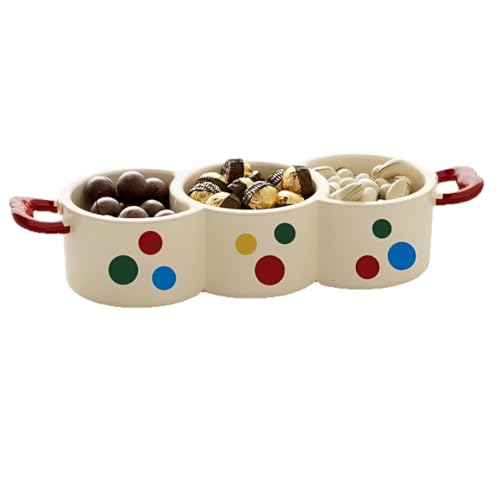 - Round tray with five separate compartments arranged around a central bowl. Designed for serving different food items such as fruits, nuts, candies, or snacks in individual sections.